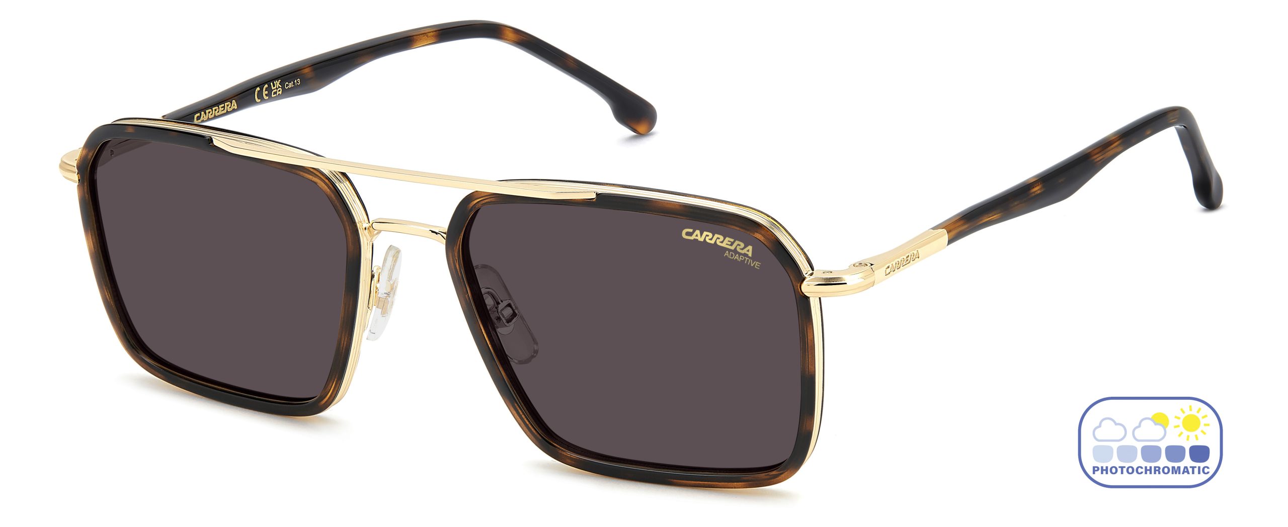 Las Carrera 362/S 2IK Q6 combinan un diseño geométrico elegante con la funcionalidad avanzada de sus lentes fotocromáticas, que se adaptan automáticamente a los cambios de luz. Su montura carey con detalles dorados aporta un toque sofisticado y atemporal, mientras que las lentes en tono Q6 (naranja adaptativo) ofrecen una visión cómoda y versátil tanto en interiores como en exteriores.